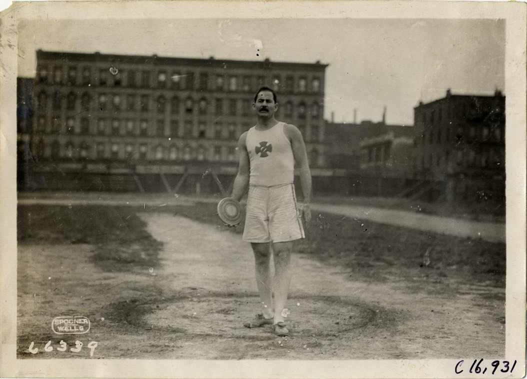 View of athlete Grahnes posing with discus at track and field event. Buildings in background. Printed on front: "Spooner, Wells." Stamped on back: "Spooner & Wells, Inc., photographers, telephones 3472-3473 Columbus, 1931 Broadway, New York." Handwritten on back: "Grahnes. Sporting events--Track and field, 1910."