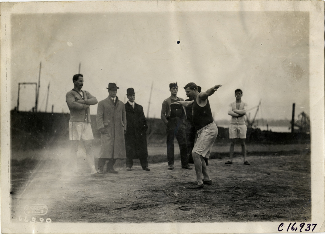 View of Pavlos competing in discus at track and field event. Athletes and officials stand nearby; buildings in background. Printed on front: "Spooner, Wells." Stamped on back: "Spooner & Wells, Inc., photographers, telephones 3472-3473 Columbus, 1931 Broadway, New York." Handwritten on back: "Sporting events--Track and field, 1910."