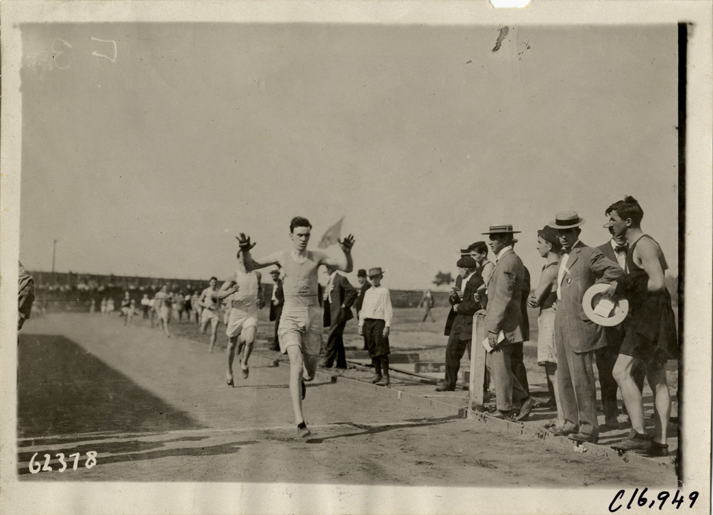 View of runner crossing finish line during the 1910 Flatbush Marathon race. Officials and athletes watch from sidelines. Stamped on back: "Spooner & Wells, Inc., photographers, telephones 3472-3473 Columbus, 1931 Broadway, New York." Handwritten on back: "The Flatbush Marathon. Sporting events--Track and field, 1910."