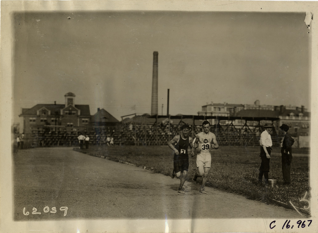 View of runners competing in the 1910 Flatbush Marathon race. Grandstand in background. Stamped on back: "Spooner & Wells, Inc., photographers, telephones 3472-3473 Columbus, 1931 Broadway, New York." Handwritten on back: "The Flatbush Marathon. Sporting events--Track and field, 1910."