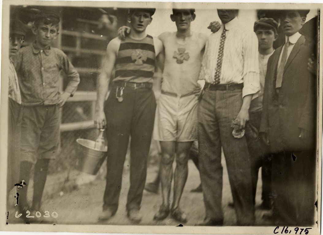 Runners posing with spectators, 1910 Flatbush Marathon