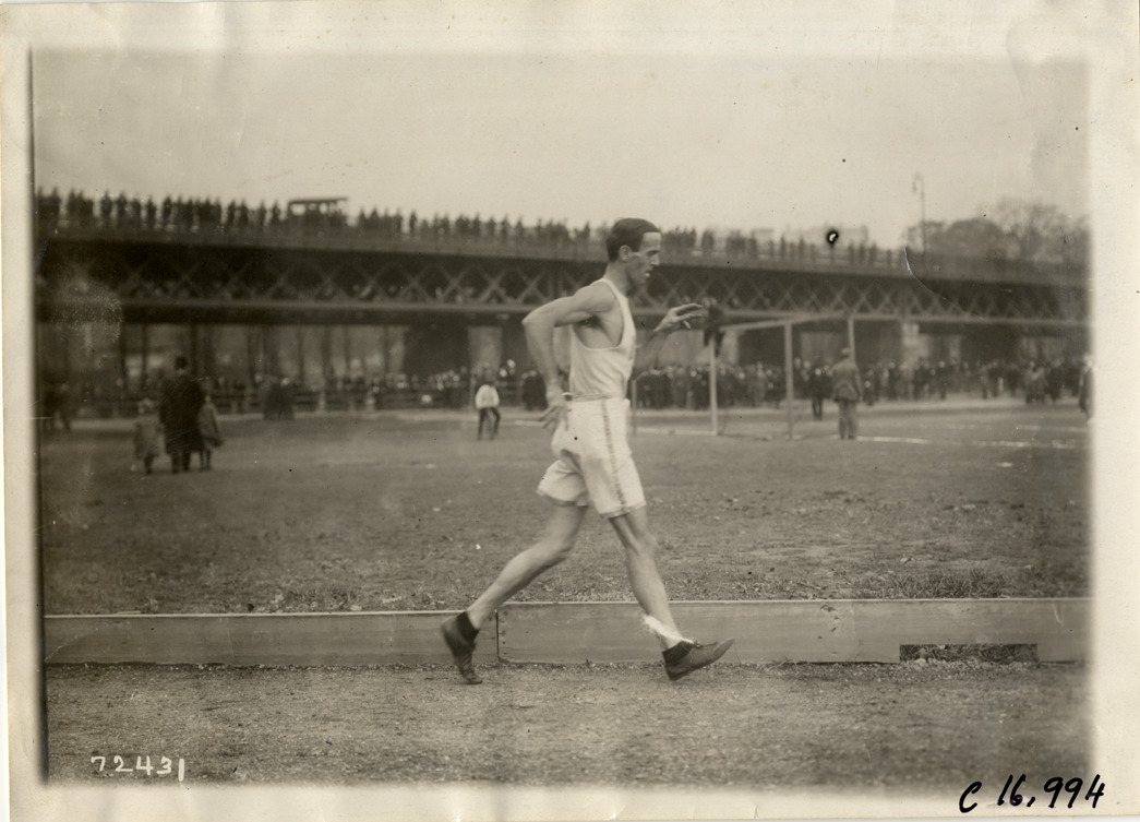 View of racewalker competing in racewalking event. Spectators watch from bridge in background. Stamped on back: "Spooner & Wells, Inc., photographers, telephones 3472-3473 Columbus, 1931 Broadway, New York." Handwritten on back: "Sporting events--Track and field, 1911."