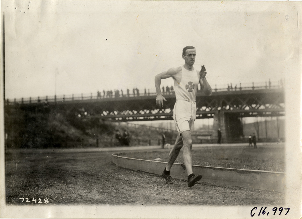 View of racewalker competing in racewalking event. Spectators watch from bridge in background. Stamped on back: "Spooner & Wells, Inc., photographers, telephones 3472-3473 Columbus, 1931 Broadway, New York." Handwritten on back: "Sporting events--Track and field, 1911."