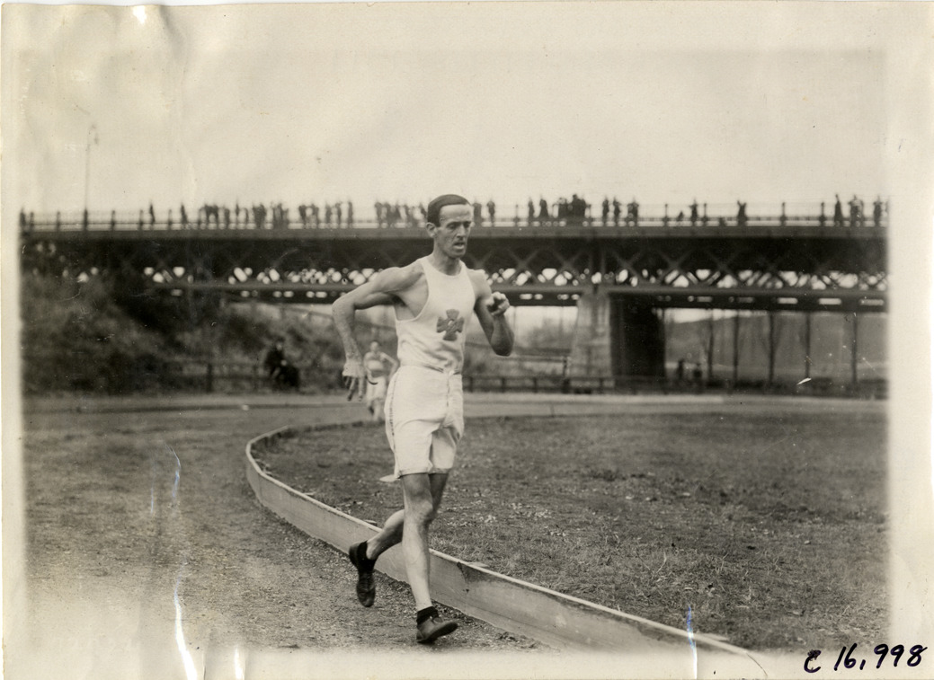 View of racewalker competing in racewalking event. Spectators watch from bridge in background. Stamped on back: "Spooner & Wells, Inc., photographers, telephones 3472-3473 Columbus, 1931 Broadway, New York." Handwritten on back: "Sporting events--Track and field, 1911."