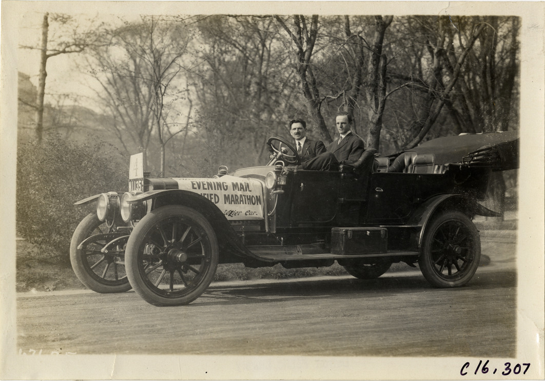 View of two officials driving Lozier car during the 1911 Evening Mail Modified Marathon. "Evening Mail Modified Marathon, Lozier car" sign is displayed on hood of car. Stamped on back: "Spooner & Wells, Inc., photographers, telephones 3472-3473 Columbus, 1931 Broadway, New York." Handwritten on back: "The Evening Mail Modified Marathon. Sporting events--Track and field, 1911."