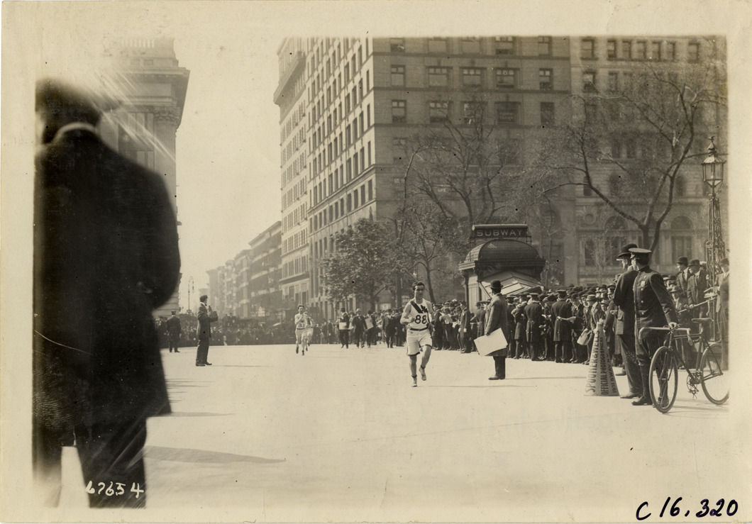 View of runners competing in the 1911 Evening Mail Modified Marathon race. Subway entrance and office buildings in background; policeman with bicycle in foreground. Spectators watch from sidewalks. Stamped on back: "Spooner & Wells, Inc., photographers, telephones 3472-3473 Columbus, 1931 Broadway, New York." Handwritten on back: "The Evening Mail Modified Marathon. Sporting events--Track and field, 1911."
