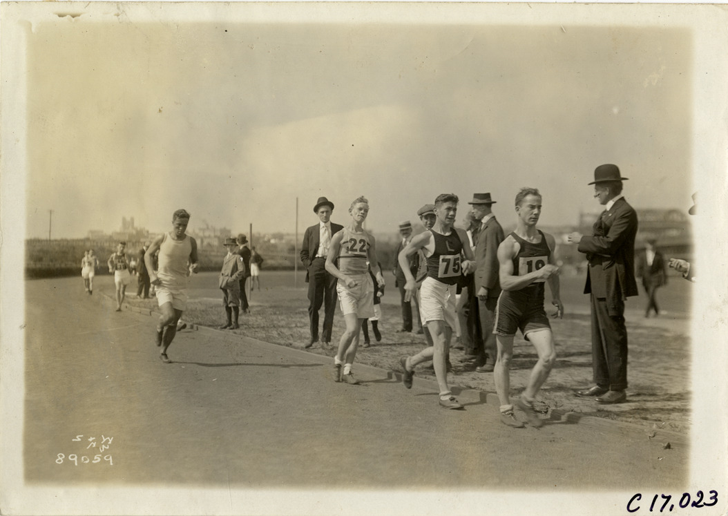 View of racewalkers competing in racewalking event. Officials watch from sidelines. Printed on front: "S&W, N.Y." Handwritten on back: "Sporting events--Track and field, 1915."