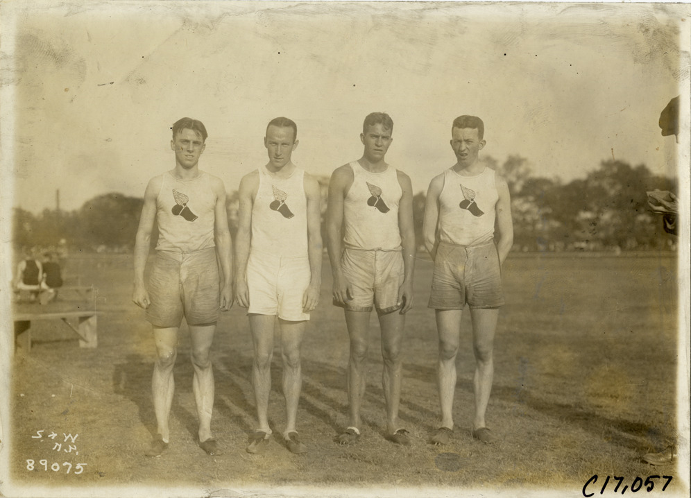 Favorite this☆ Track and field athletes Description: View of four track and field athletes posing on field during track and field competition. Printed on front: "S&W, N.Y." Handwritten on back: "Sporting events--Track and field, 1915." Details Resource ID: na018817 Creator: Spooner & Wells Subject: Track and field athletes Track and field--Tournaments Photographers--New York (State)--New York Photographic prints Date Issued: 1915 Format: 1 photographic print ; 5 x 6.75 in. Member of: National Automotive History Collection Lazarnick Collection Filing Location: Sporting events--Track and field, 1915 #3 Negative Number: Negative #C17,057 Rights: Physical rights are retained by DPL. Copyright is retained in accordance with U.S. copyright laws.