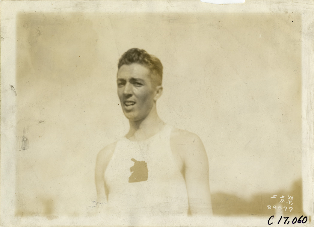 Close-up view of track and field athlete. Printed on front: "S&W, N.Y." Handwritten on back: "Sporting events--Track and field, 1915."