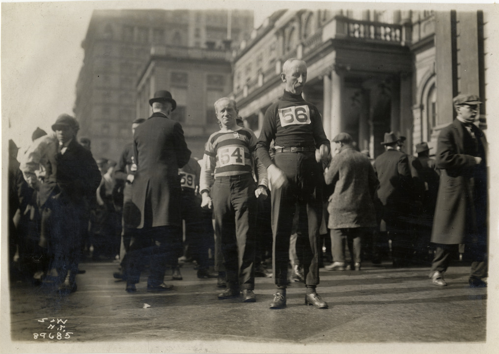 View of marathon runners standing in front of building. Officials, spectators and runners in background. Printed on front: "S&W, N.Y." Handwritten on back: "Sporting events--Track and field, 1915."