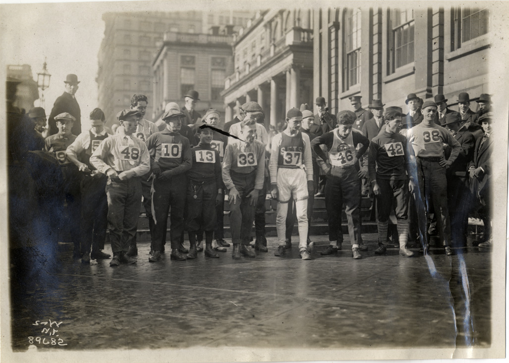 Favorite this☆ Marathon runners lined up in front of building Description: View of marathon runners lined up in front of building. Printed on front: "S&W, N.Y." Handwritten on back: "Sporting events--Track and field, 1915." Details Resource ID: na018837 Creator: Spooner & Wells Subject: Runners (Sports) Marathon running--Competitions Photographers--New York (State)--New York Photographic prints Date Issued: 1915 Format: 1 photographic print ; 5 x 7 in. Member of: National Automotive History Collection Lazarnick Collection Filing Location: Sporting events--Track and field, 1915 #4 Rights: Physical rights are retained by DPL. Copyright is retained in accordance with U.S. copyright laws.