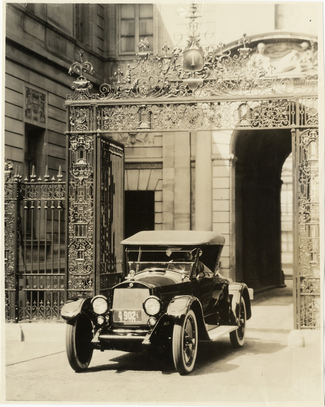 View of 1922 Standard Eight roadster car parked under ornate gate in front of building. Stamped on back: "N. Lazarnick, commercial photographers, makers of industrial motion pictures, 246 W. 42nd St., N.Y. Tel. Bryant 0594." Typed on back: "Standard Eight roadster."