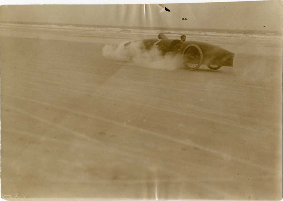 View of driver Fred Marriot in "Rocket" Stanley Steamer car no. 2 on Ormond Beach during the 1906 Ormond-Daytona races in Florida. Stamped on back: "Photo by F. Ed. Spooner, 1536 B'way, telephone 6536-38th St., New York, N.Y." Handwritten on back: "Marriott [sic], Stanley 'Rocket,' Daytona-Ormond, 1906. Ormond Beach. Stanley Steamer, 1906."