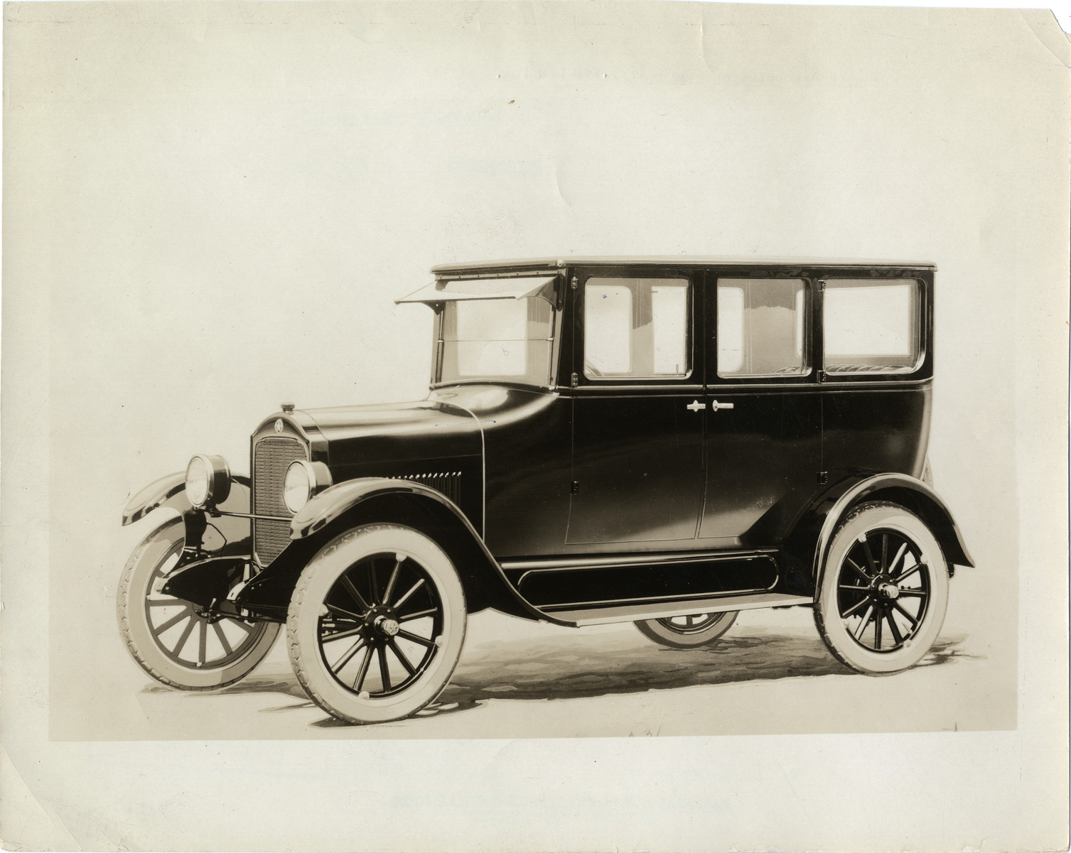 View of Star sedan car. Stamped on back: "N. Lazarnick, commercial photographers, makers of industrial motion pictures, 246 W. 42d St., N.Y., Tel. Chickering 1717-18. 5005 Euclid Ave., Cleve., Randolph 7852." Typed on back: "New Star car standard sedan, $795, fob Lansing." Handwritten on back: "Star."