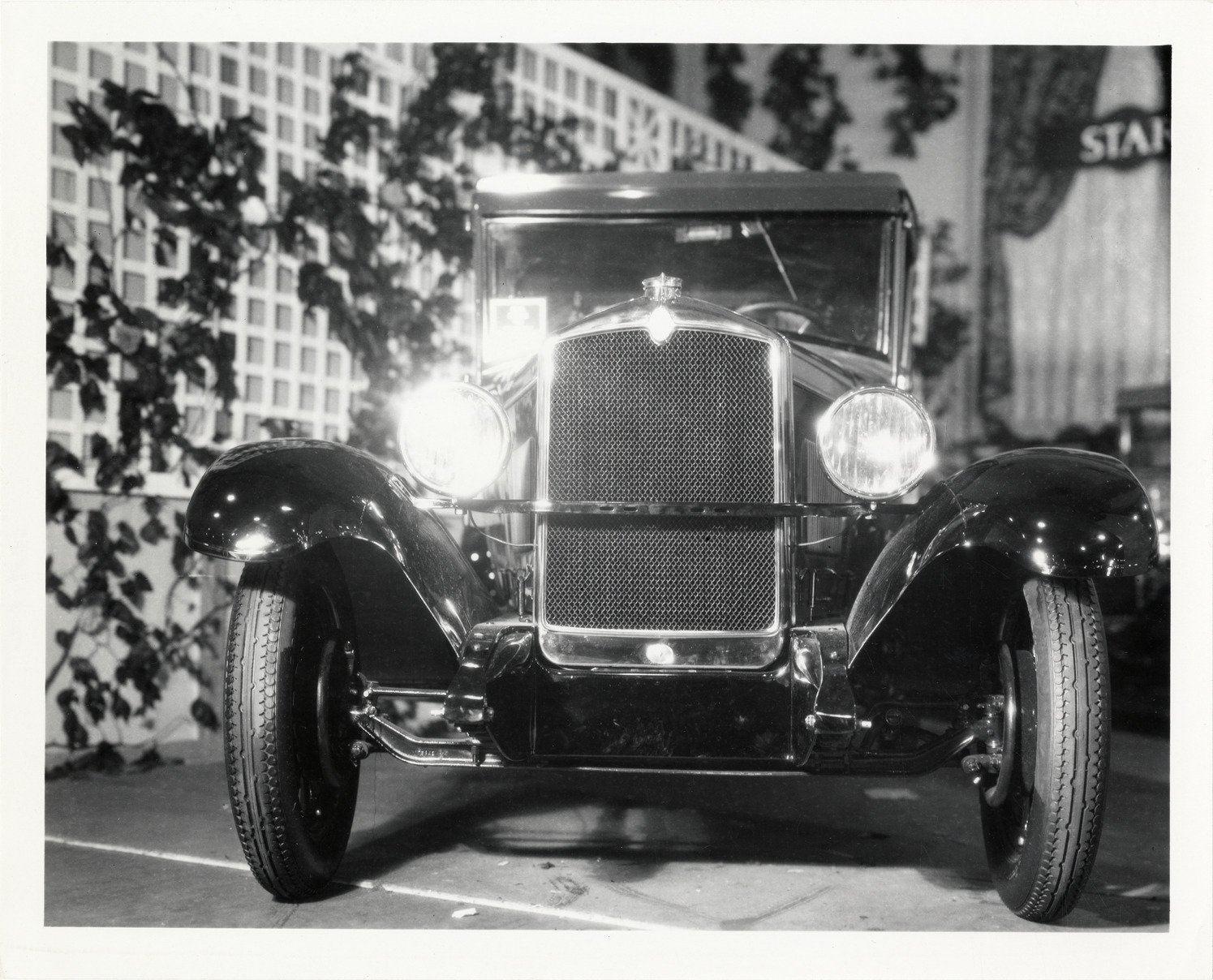 Front view of 1928 Star car at unidentified automobile show. Handwritten on back: "Auto show, 1928. Star (New Jersey), 1928."