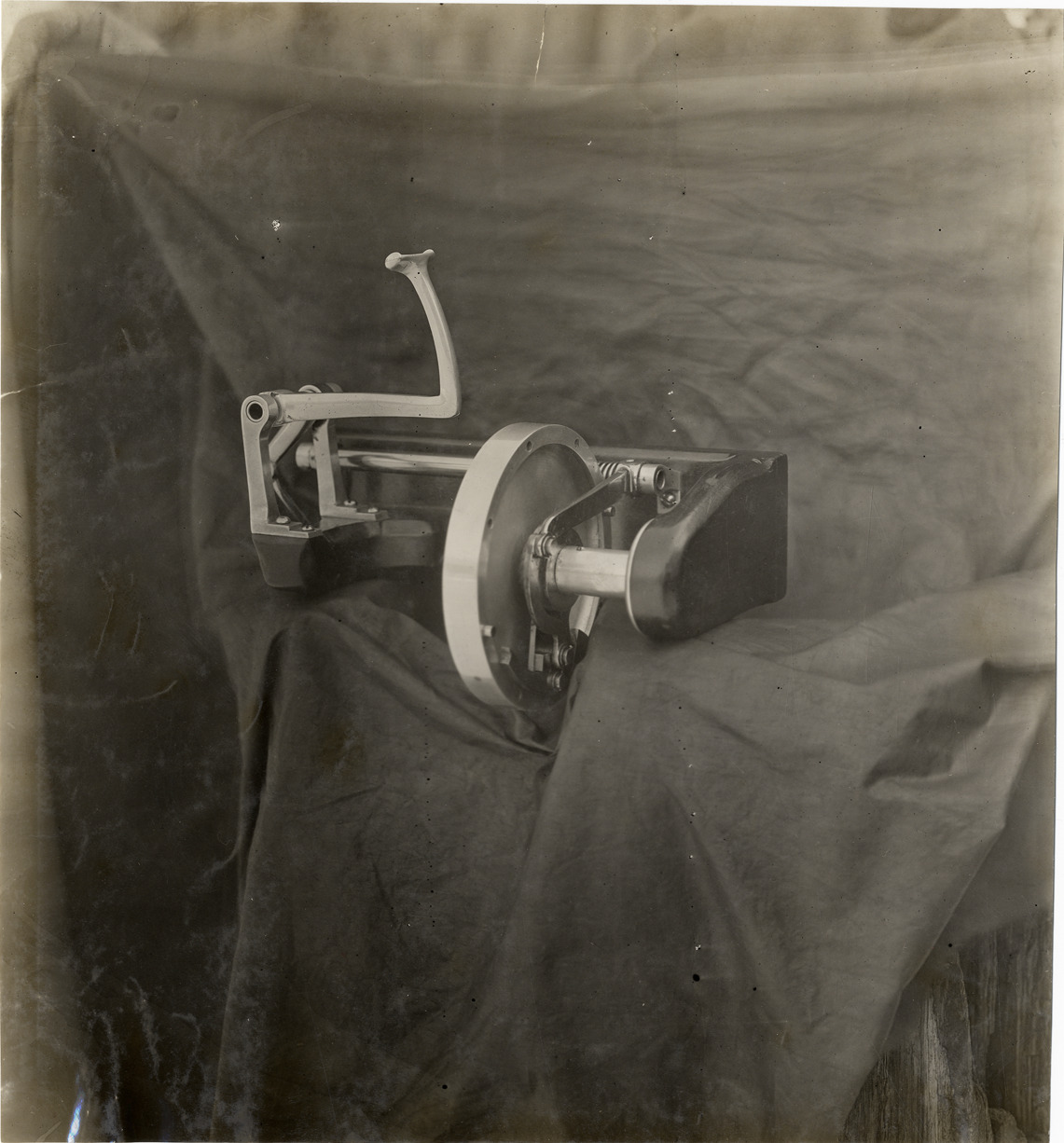 Close-up view of Wilkinson starter, manufactured by J. Franklin Wilkinson. Stamped on back: "Spooner & Wells, Inc., photographers, telephone North 1745. 1231 Woodward Ave., Detroit, Mich. Detroit, 1231 Woodward, New York, 1931 Broadway." Handwritten on back: "J. Franklin Wilkinson mechanical starter. Starters, Wilkinson starter, 1910."