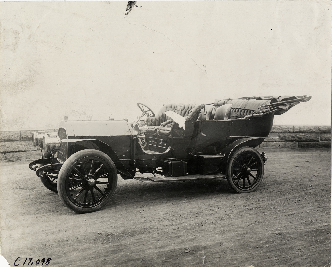 View of 1908 Stearns car. Handwritten on back: "Stearns, 1908."