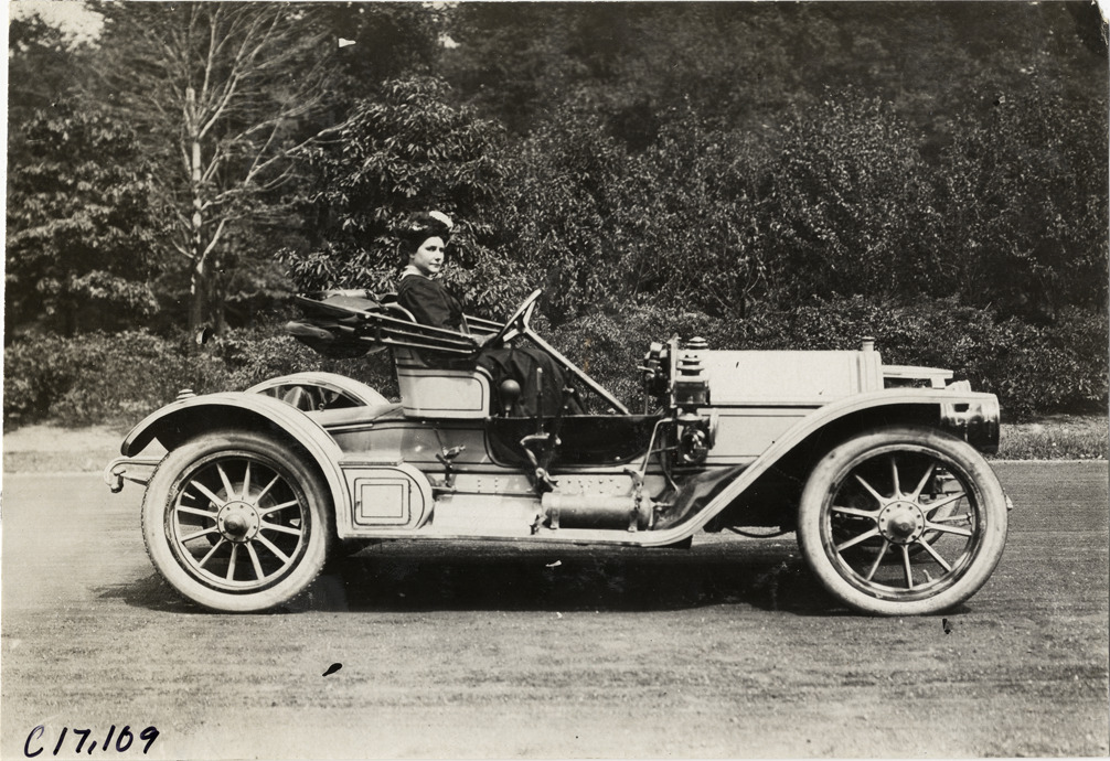 Mrs. Otis posing in 1908 Stearns automobile