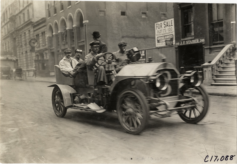 View of driver and passengers in 1909 Stearns car no. 3 during the 1909 Ocean to Ocean, New York to Seattle contest. Buildings in background. Stamped on back: "Spooner & Wells, Inc., photographers, telephones 3472-3473 Columbus, 1931 Broadway, New York." Handwritten on back: "Stearns, 1909."
