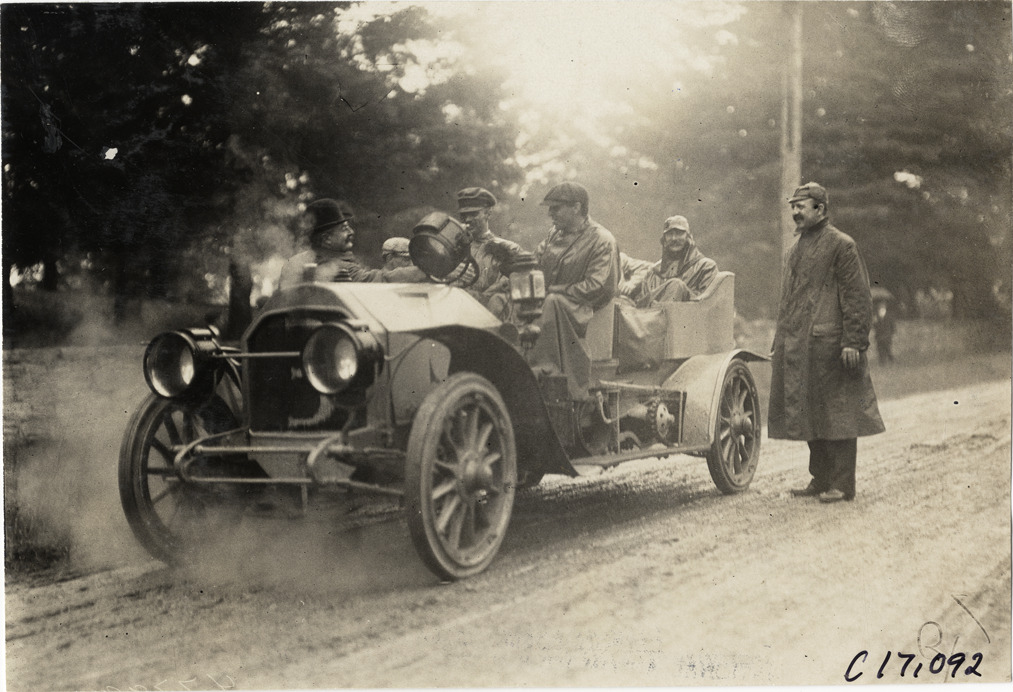 Driver and passengers with 1909 Stearns automobile, 1909 Ocean to Ocean, New York to Seattle contest