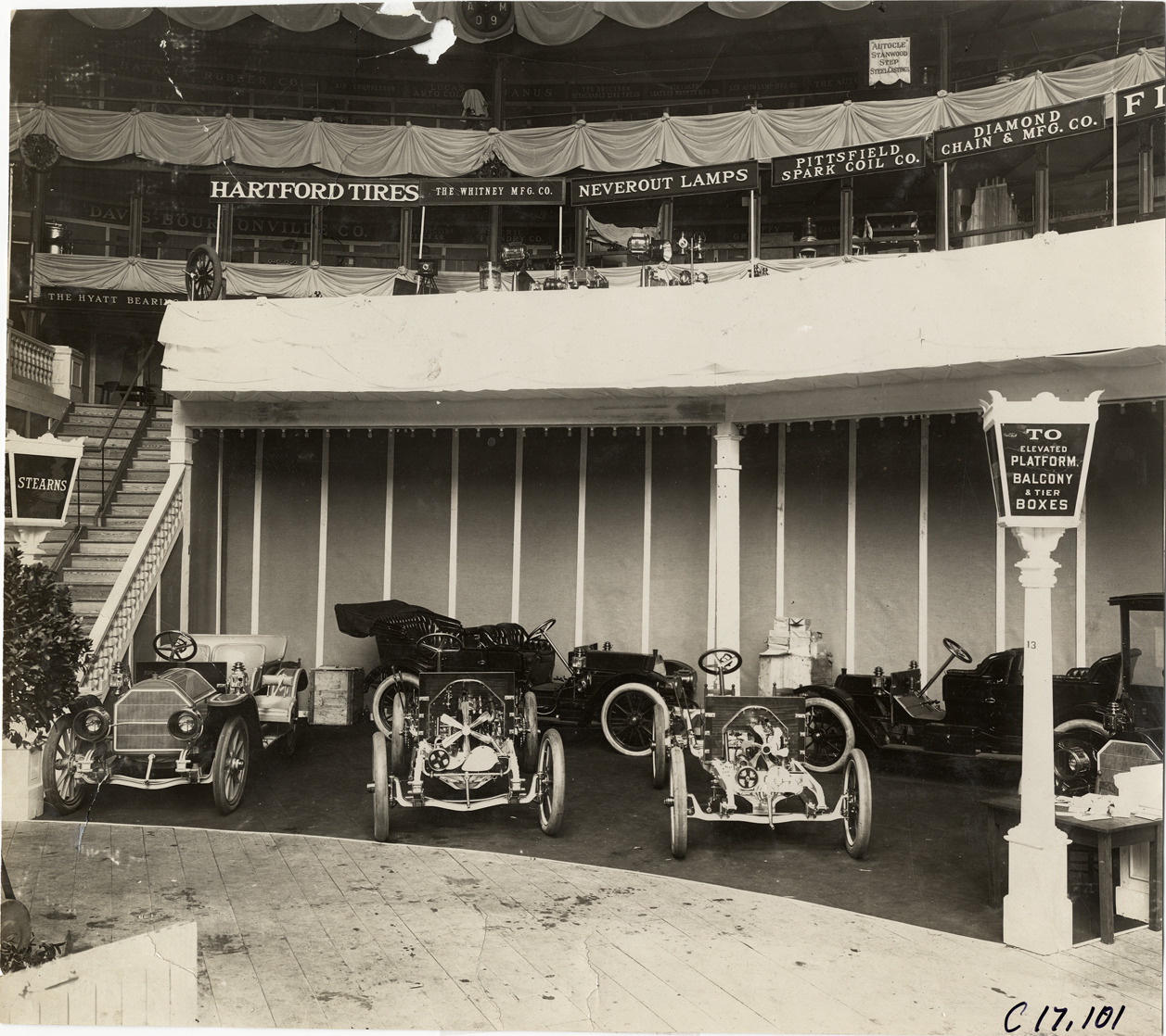 Favorite this☆ 1909 Stearns automobiles on display at trade show Description: View of 1909 Stearns cars on display at unidentified trade show. "Stearns" and "To elevated platform, balcony & tier boxes" lampposts in foreground. Stamped on back: "Spooner & Wells, Inc., photographers, telephones 3472-3473 Columbus, 1931 Broadway, New York." Handwritten on back: "Stearns, 1909." Details Resource ID: na018946 Creator: Spooner & Wells Subject: Automobiles F.B. Stearns Company Trade shows Photographers--New York (State)--New York Photographic prints Date Issued: Unknown year Format: 1 photographic print ; 7.5 x 8.5 in. Member of: National Automotive History Collection Lazarnick Collection Filing Location: Stearns, 1909 Negative Number: Negative #C17,101 Rights: Physical rights are retained by DPL. Copyright is retained in accordance with U.S. copyright laws.