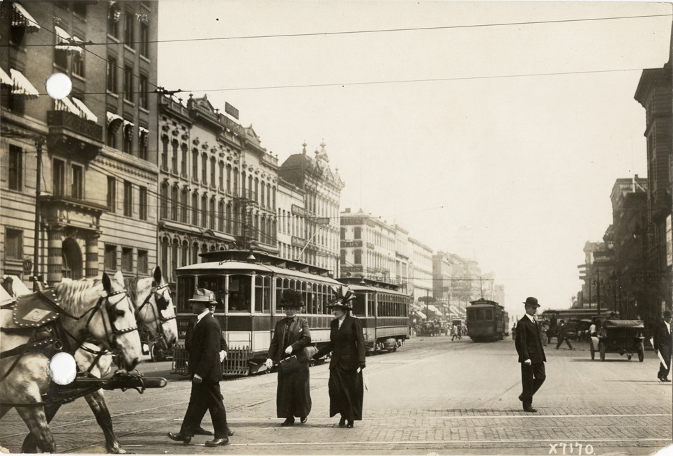Favorite this☆ Pedestrians crossing street Description: View of pedestrians crossing street in Detroit, Michigan. Horses in foreground; streetcars, Hotel Metropole and commercial buildings in background. Handwritten on back: "Danger on streets. Street scenes." Details Resource ID: na018979 Subject: Cable cars (Streetcars)--Michigan--Detroit Pedestrians--Michigan--Detroit Streets--Michigan--Detroit Photographic prints Date Issued: Unknown year Format: 1 photographic print ; 4.5 x 6.5 in. Member of: National Automotive History Collection Lazarnick Collection Filing Location: Street scenes Rights: Physical rights are retained by DPL. Copyright is retained in accordance with U.S. copyright laws.