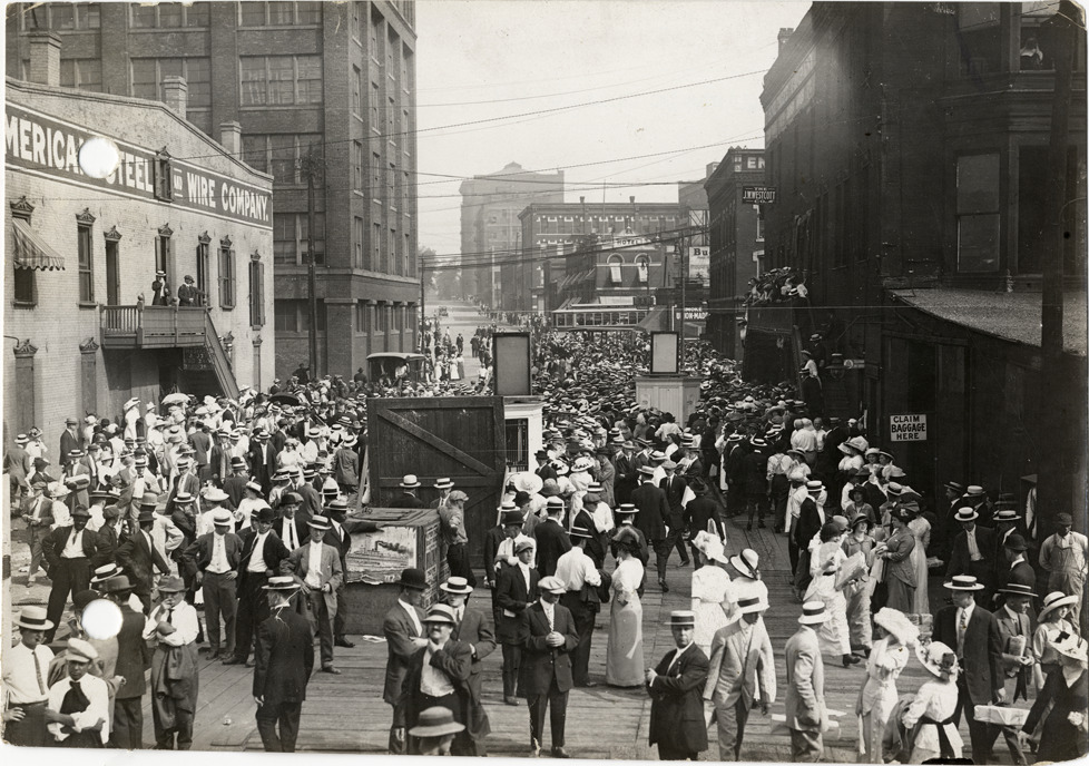 Favorite this☆ Crowd at White Star Line dock Description: View of crowd at the White Star Line dock. American Steel and Wire Company building on left; J.W. Westcott building on right. Hotel and streetcar in background. Handwritten on back: "White Star Line dock. Street scenes." Details Resource ID: na018984 Subject: Crowds Docks White Star Line Photographic prints Date Issued: Unknown year Format: 1 photographic print ; 4.5 x 6.5 in. Member of: National Automotive History Collection Lazarnick Collection Filing Location: Street scenes Rights: Physical rights are retained by DPL. Copyright is retained in accordance with U.S. copyright laws.
