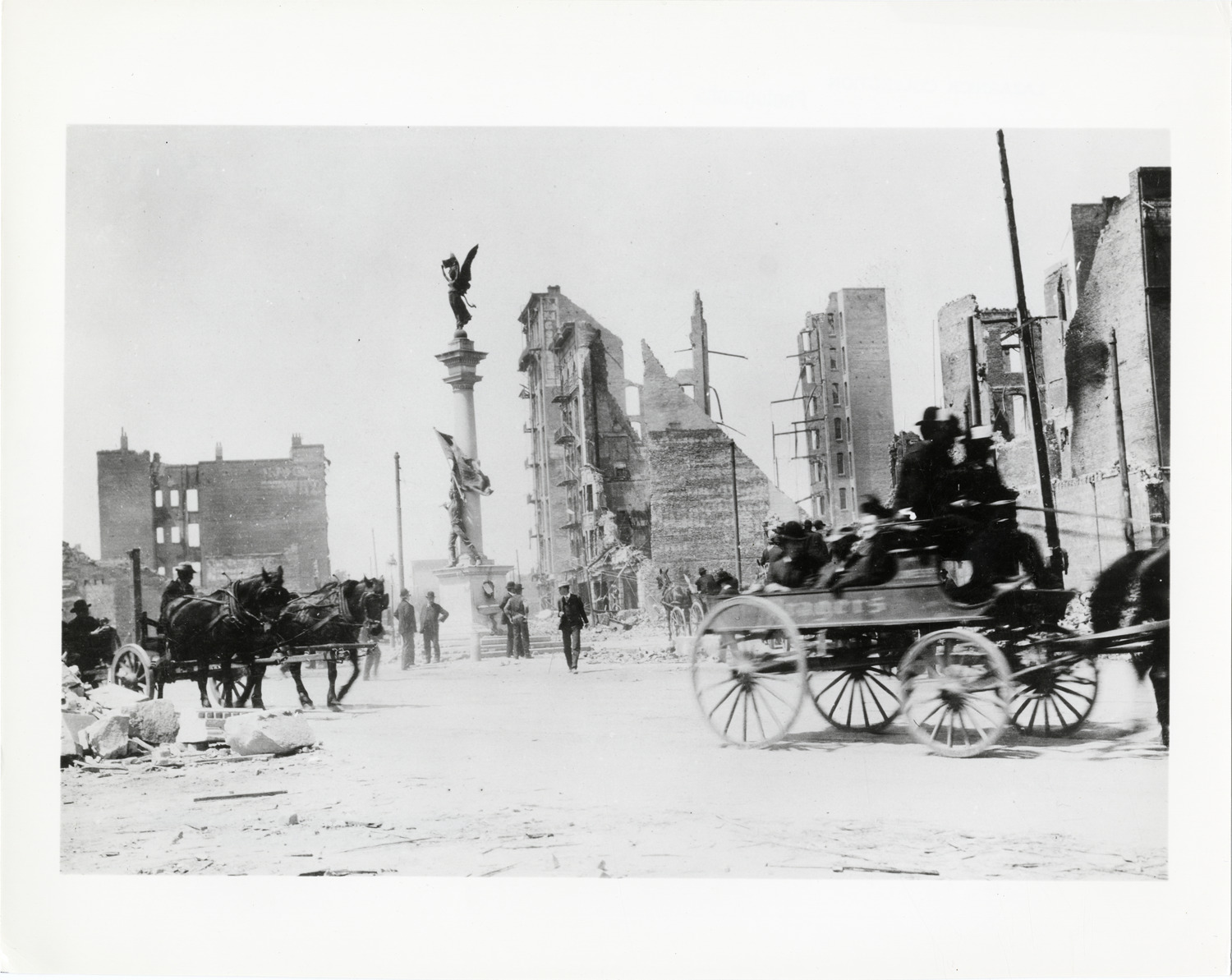 View of horse-drawn wagons passing in front of James D. Phelan monument during aftermath of 1906 earthquake and fire in San Francisco, California. Ruined buildings in background. Typed on back: "L-1404. San Francisco, April, 1906, an earthquake, a fire, a desolate ruin, in which the fledgling auto proved itself to a nation. As fire levelled 3/4 of the city, the automobile became the only dependable wheeled vehicle that moved in the stricken city. Nearly 500 city blocks were destroyed and 1/4 million people were left homeless as a result of the catastrophe. Also see L-1405, L-1406 and L-535." Handwritten on back: "Street scenes."