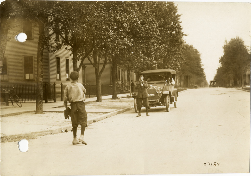 View of two boys playing catch with baseball and baseball gloves in street in the path of an oncoming car. Houses in background. Handwritten on back: "Danger on streets. Street scenes."