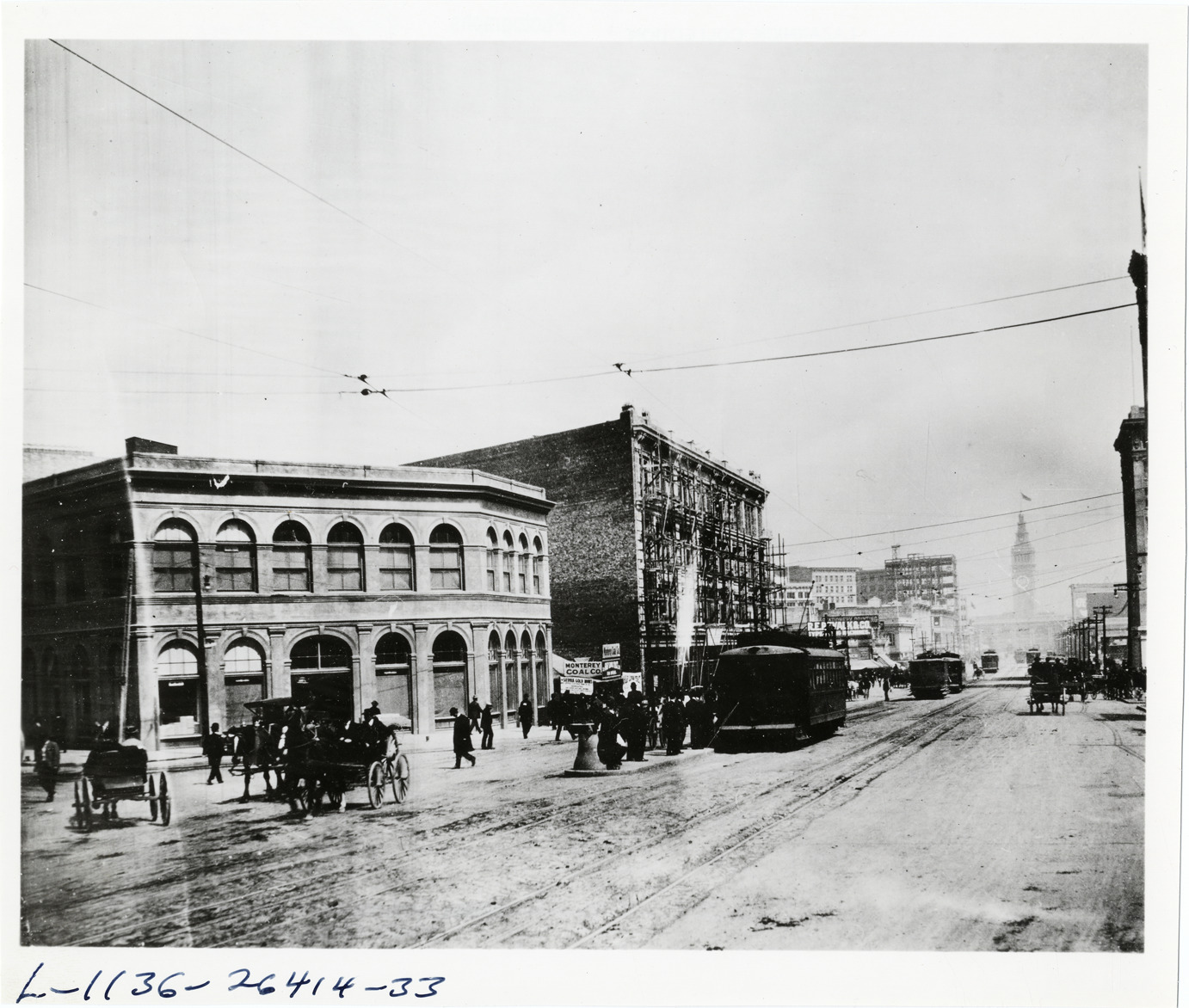 View of streetcars, pedestrians, horse-drawn vehicles, cars and commercial vehicles on Market Street in San Francisco, California. Typed on back: "Old dobin [sic] dominated Market Street in San Francisco during the early part of 1908. The one automobile shown turning a corner was a forerunner of what was to come in the automobile age." Handwritten on back: "Street scenes."