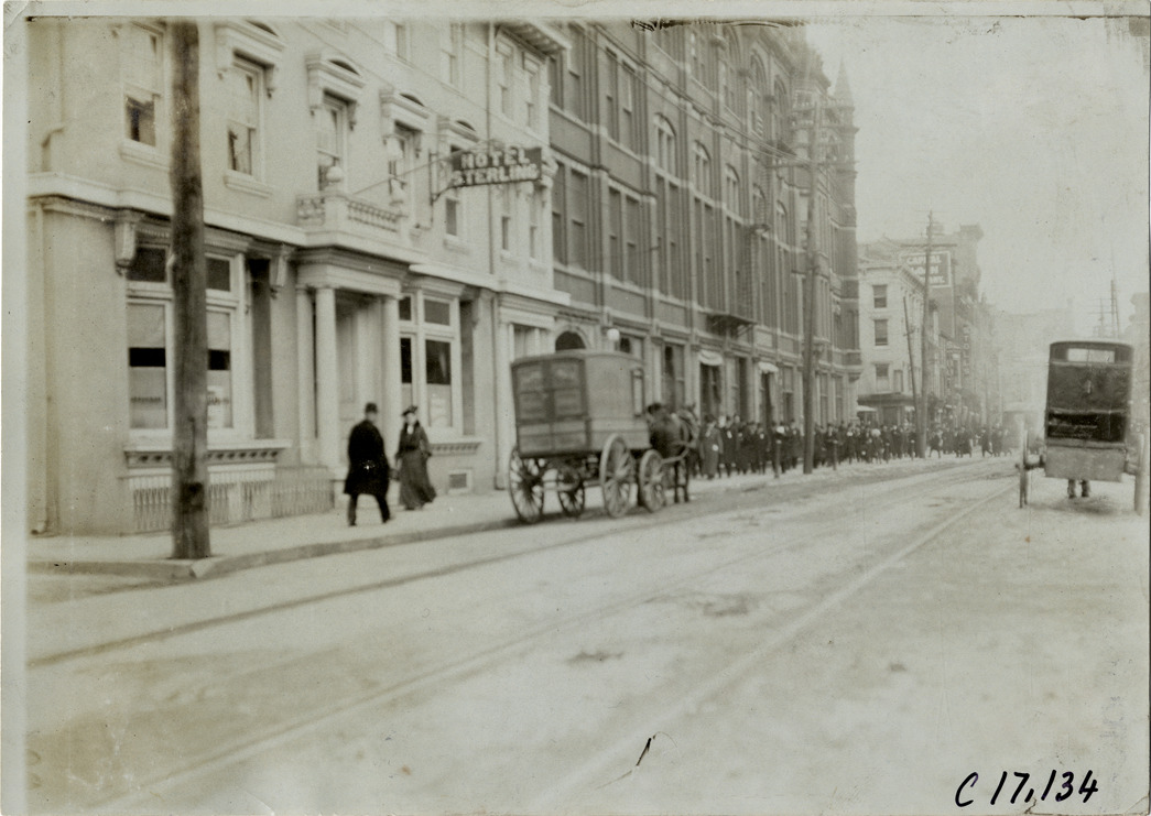 Favorite this☆ Horse-drawn wagon parked in front of Hotel Sterling Description: View of horse-drawn wagon parked in front of Hotel Sterling. Large group of men walk on sidewalk in background. Handwritten on back: "Streets, 1905." Details Resource ID: na019017 Subject: Streets Horse-drawn vehicles Hotels Pedestrians Photographic prints Date Issued: 1905 Format: 1 photographic print ; 5 x 7 in. Member of: National Automotive History Collection Lazarnick Collection Filing Location: Streets #1 Negative Number: Negative #C17,134 Rights: Physical rights are retained by DPL. Copyright is retained in accordance with U.S. copyright laws.