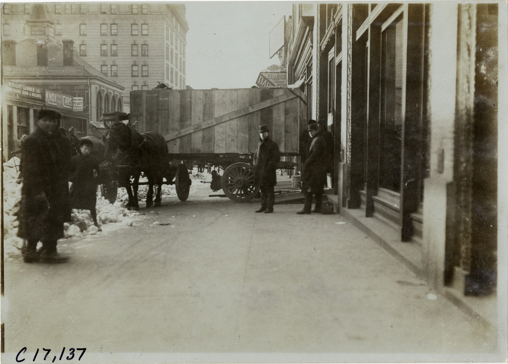 Favorite this☆ Horse-drawn wagon hauling load of snow Description: View of men standing on sidewalk in front of horse-drawn wagon hauling load of snow. Commercial buildings in background. Handwritten on back: "Streets, 1905." Details Resource ID: na019020 Subject: Streets Horse-drawn vehicles Roads--Snow and ice control Snow Photographic prints Date Issued: 1905 Format: 1 photographic print ; 5 x 7 in. Member of: National Automotive History Collection Lazarnick Collection Filing Location: Streets #1 Negative Number: Negative #C17,137 Rights: Physical rights are retained by DPL. Copyright is retained in accordance with U.S. copyright laws.
