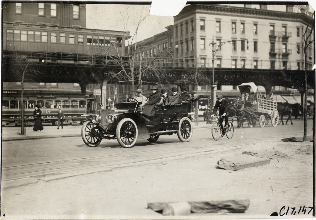View of man riding bicycle behind motorists in car on street in New York, New York. Streetcar, horse-drawn wagon and elevated train in background. Handwritten on back: "N.Y. streets, '09. Streets, 1909."