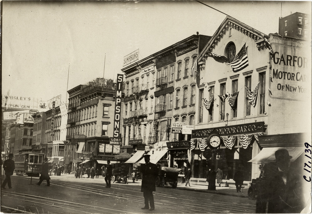 View of police officer standing in street in front of row of commercial buildings. Businesses include the Simpson's Loan Brokers, Parisian Shop and an automobile dealership. Stamped on back: "Spooner & Wells, Inc., photographers, telephones 3472-3473 Columbus, 1931 Broadway, New York." Handwritten on back: "Streets, 1909."
