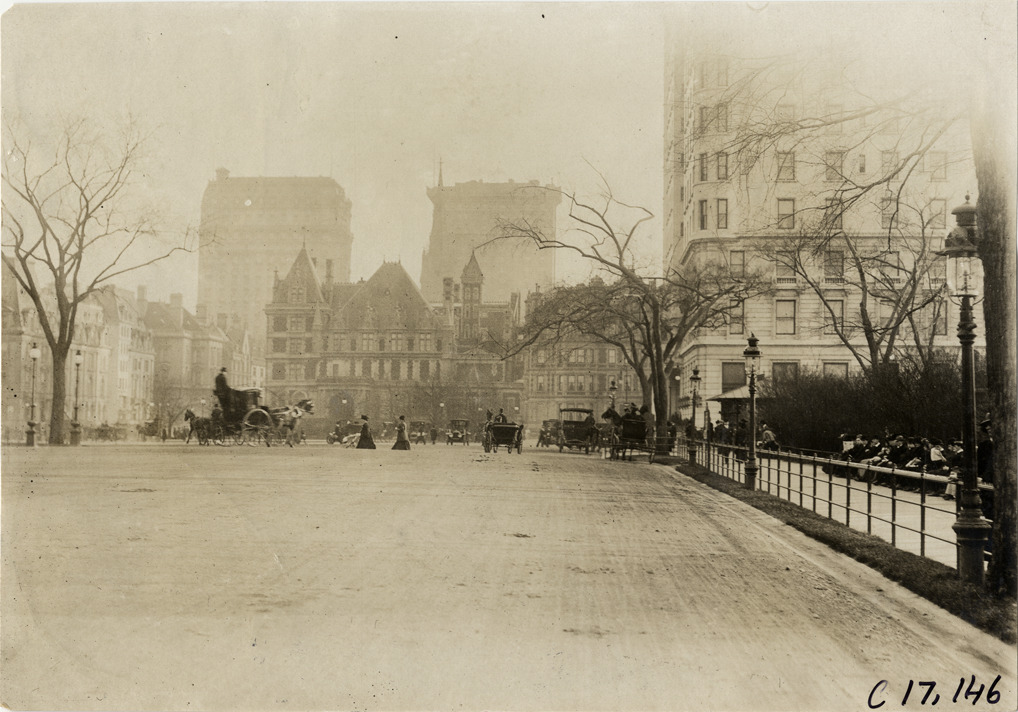 View of pedestrians, automobiles and horse-drawn carriage in Central Park near 59th St. and 5th Ave. in New York, New York. Handwritten on back: "Central Park, 59th & 5th Ave. Streets, 1909."