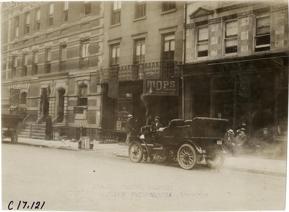 View of men with car in front of W.J. Duane & Company store located at 304 W. 54th Street in New York. Sign on building reads: "Tops for autos. W.J. Duane & Co." Stamped on back: "F. Ed. Spooner, and Chas. S. Wells. Motor News, Motor Photos, Motor Adv, 1536 B'way, New York. Tel 6536-38th St." Handwritten on back: "N.Y. street, 1909. Streets, 1906."