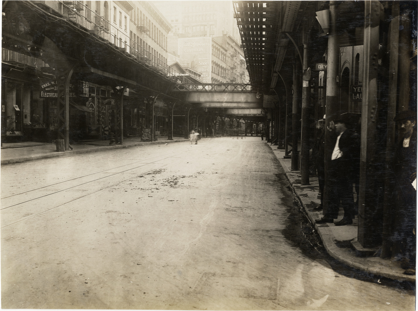 View of empty street with elevated train tracks. Men stand on sidewalk; buildings partially visible above tracks. Handwritten on back: "Streets, 1906."