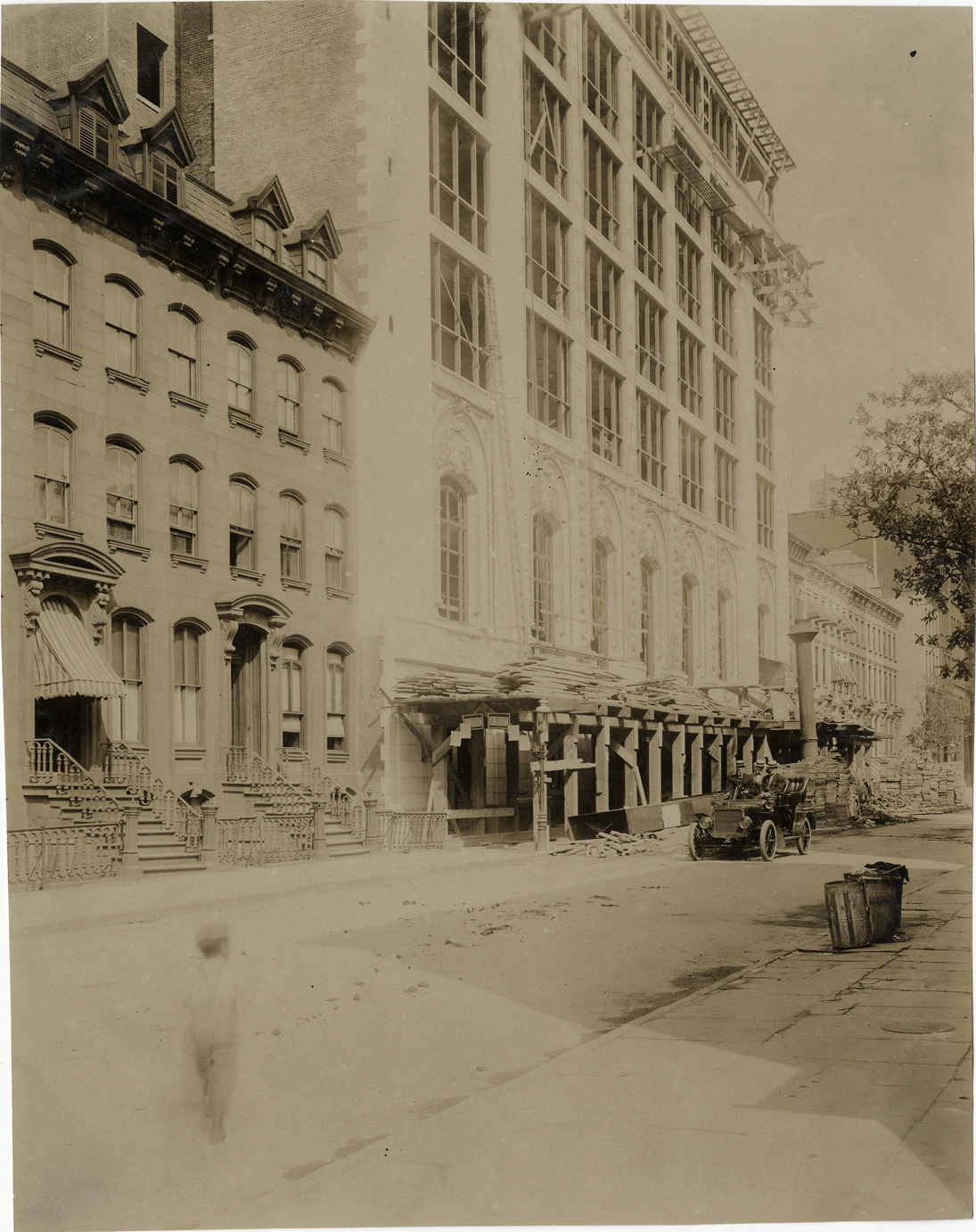 View of men in car, parked in front of building under construction. Scaffolding sits below row of decorative arched windows; pile of construction debris in front of building. Stamped on back: "F. Ed. Spooner, and Chas. S. Wells. Motor News, Motor Photos, Motor Adv, 1536 B'way, New York. Tel 6536-38th St." Handwritten on back: "Streets, 1907."