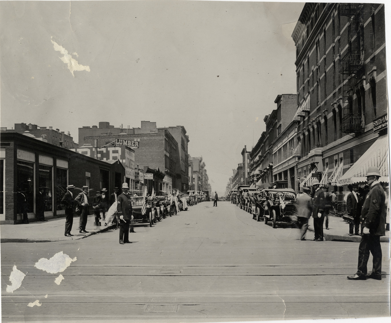 Favorite this☆ Oldsmobile automobiles parked in street Description: View of Oldsmobile cars parked on both sides of street, some decorated with flags or pennants. Two policemen and several men stand in foreground. Handwritten on back: "Streets, 1908." Details Resource ID: na019076 Subject: Oldsmobile automobile Streets Police Photographic prints Date Issued: 1908 Format: 1 photographic print ; 7.75 x 9.25 in. Member of: National Automotive History Collection Lazarnick Collection Filing Location: Streets #3 Rights: Physical rights are retained by DPL. Copyright is retained in accordance with U.S. copyright laws.