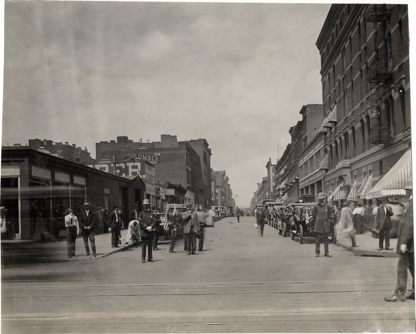 Favorite this☆ Oldsmobile automobiles parked in street Description: View of Oldsmobile cars parked on both sides of street, some decorated with flags or pennants. Two policemen and several men stand in foreground. Handwritten on back: "Streets, 1908." Details Resource ID: na019077 Subject: Oldsmobile automobile Streets Police Photographic prints Date Issued: 1908 Format: 1 photographic print ; 7.5 x 9.25 in. Member of: National Automotive History Collection Lazarnick Collection Filing Location: Streets #3 Rights: Physical rights are retained by DPL. Copyright is retained in accordance with U.S. copyright laws.
