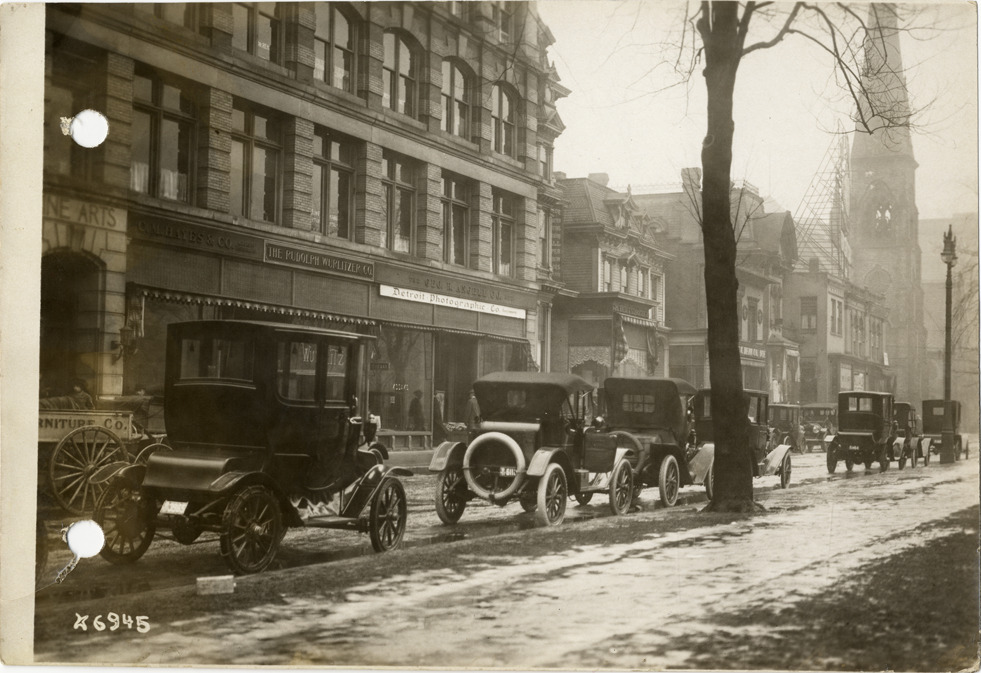 View of several cars, including electric cars, parked along curb on Adams Street across from the Rudolph Wurlitzer Company, C.M. Hayes & Co. and Detroit Photographic Company stores. Church steeple in background. Stamped on back: "Spooner & Wells, Inc., photographers, 1231 Woodward Ave., Detroit, Mich., telephone North 1745." Handwritten on back: "Motor cars lined up down town (taken for Det. Sat. Night). Streets--Detroit."