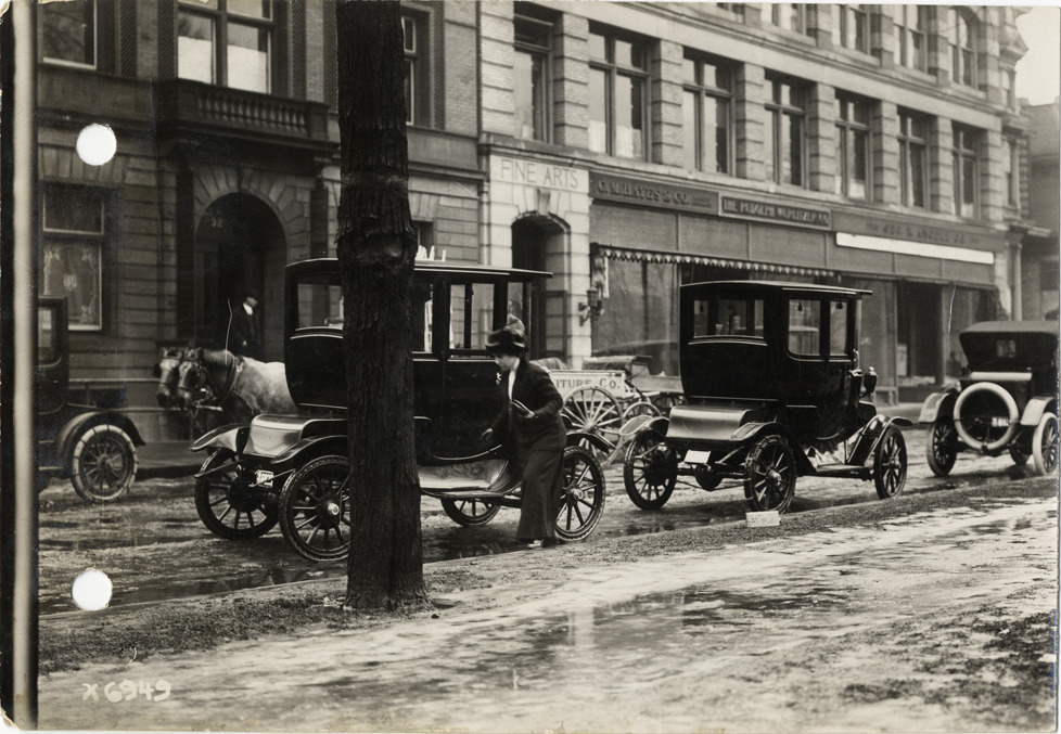 View of several electric cars parked along curb on Adams Street across from the Fine Arts Building; woman steps onto sidewalk. Horse-drawn wagon in background. Handwritten on back: "Detroit electrics. Taken for Detroit Saturday Night. Streets--Detroit."