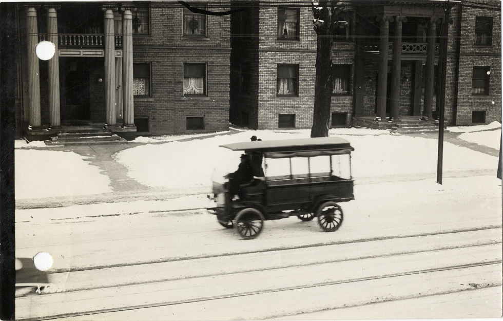 Favorite this☆ Truck on Woodward Avenue Description: View of truck traveling past brick apartment buildings on snow-covered Woodward Ave. Handwritten on back: "On Woodward Ave., opposite S&W office. Streets--Detroit." Details Resource ID: na019093 Subject: Trucks--Michigan--Detroit Apartment houses--Michigan--Detroit Woodward Avenue (Mich.) Photographic prints Date Issued: Unknown year Format: 1 photographic print ; 4.25 x 6.5 in. Member of: National Automotive History Collection Lazarnick Collection Filing Location: Streets--Detroit Rights: Physical rights are retained by DPL. Copyright is retained in accordance with U.S. copyright laws.