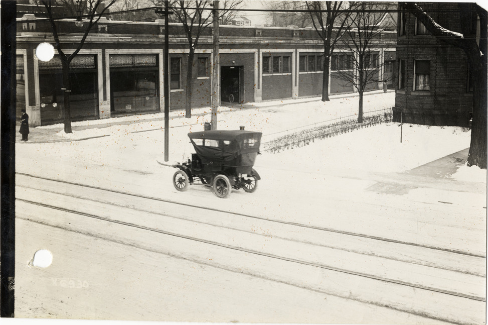View of car on the corner of snow-covered Woodward and Hendrie Avenues. One-story brick building in background. Handwritten on back: "Street scene in winter on Woodward & Hendrie Aves. Streets--Detroit."