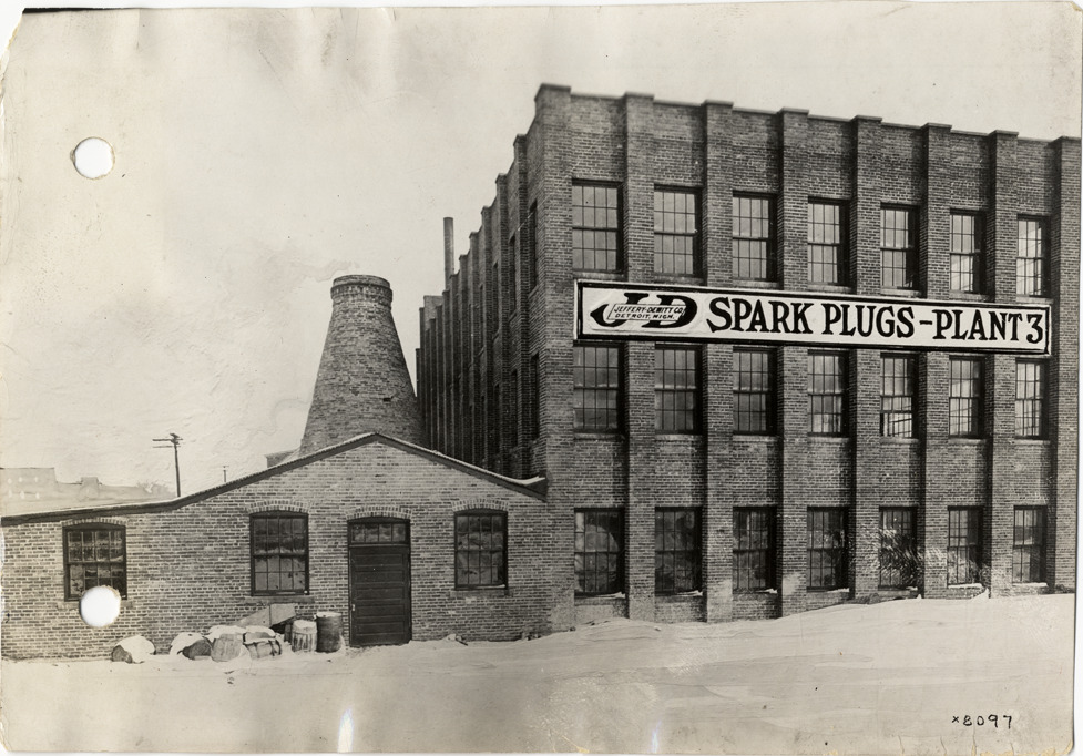 View of Jeffery-Dewitt Company Plant no. 3. Brick factory building has smokestack and "Jeffery-Dewitt Co., Detroit, Mich. JD spark plugs, plant 3" sign displayed on building facade. Handwritten on back: "Jeffery-DeWitt Plant 3 for J. Walter Thompson Co. Streets--Detroit."