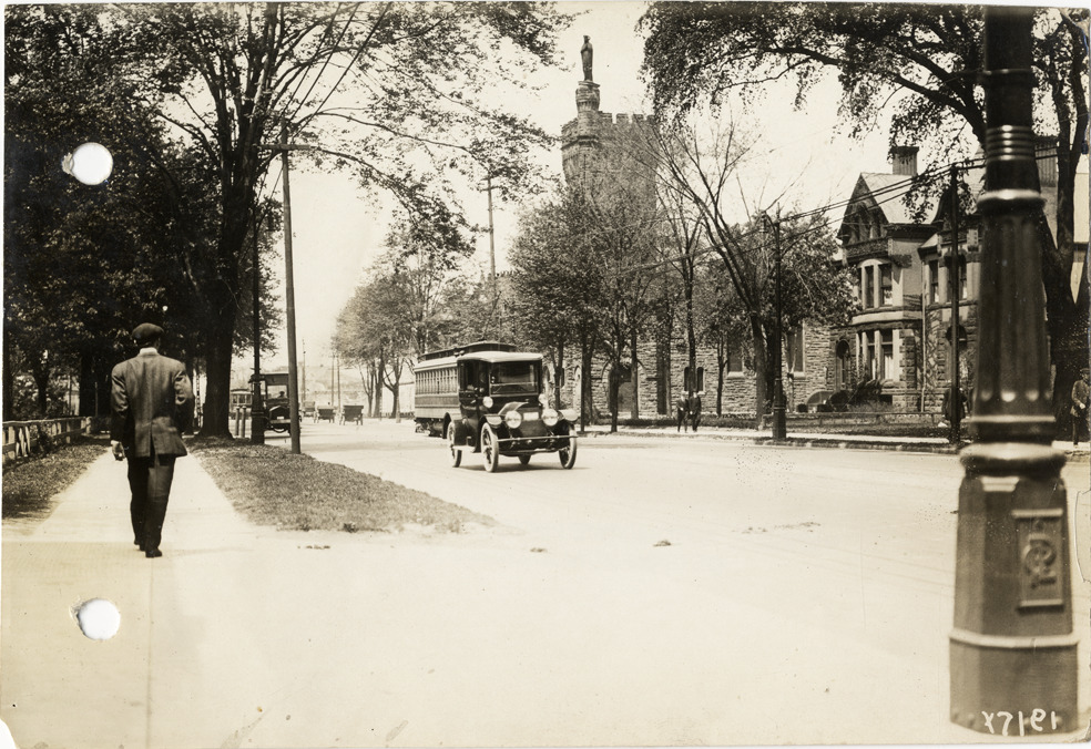 View of car and streetcar traveling on Woodward Ave. near Medbury Ave. Holy Rosary Roman Catholic Church in background; man walks on sidewalk. Handwritten on back: "Scene near Woodward & Medbury Aves. Streets--Detroit."