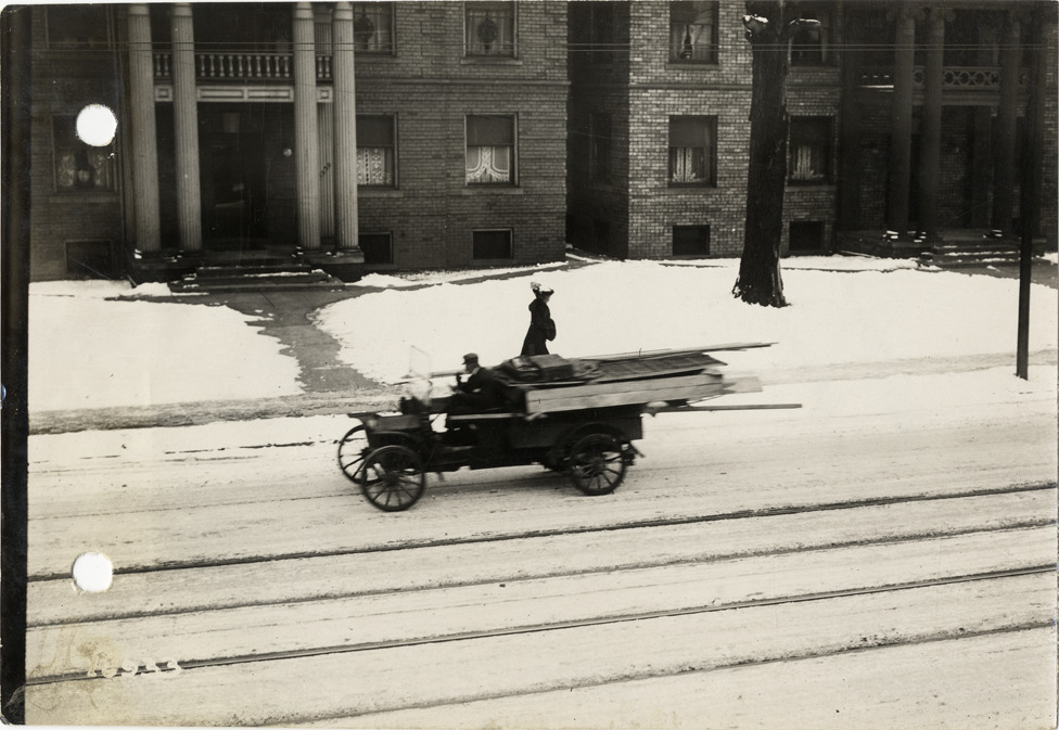 Favorite this☆ Truck on Woodward Avenue Description: View of truck traveling past brick apartment buildings on snow-covered Woodward Ave. Woman walks on sidewalk. Handwritten on back: "On Woodward Ave., opposite S&W office. Streets--Detroit." Details Resource ID: na019105 Subject: Trucks--Michigan--Detroit Apartment houses--Michigan--Detroit Woodward Avenue (Mich.) Photographic prints Date Issued: Unknown year Format: 1 photographic print ; 4.5 x 6.5 in. Member of: National Automotive History Collection Lazarnick Collection Filing Location: Streets--Detroit Rights: Physical rights are retained by DPL. Copyright is retained in accordance with U.S. copyright laws.