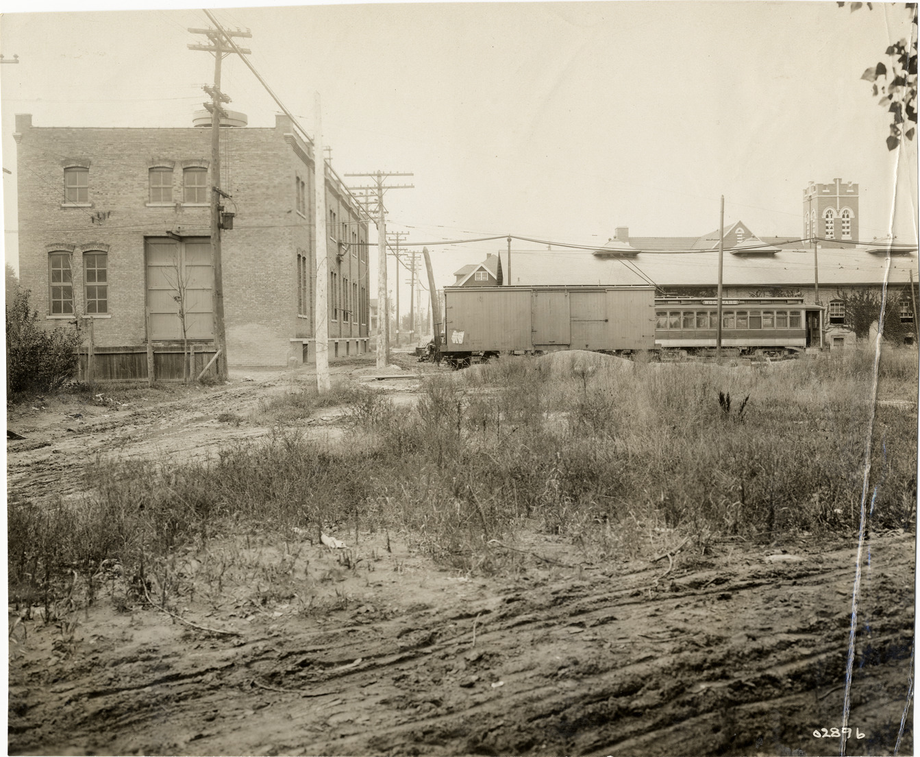 View of Woodward Ave. streetcar and railroad freight car parked next to one-story brick building in Highland Park, Michigan. Empty lot in foreground; brick commercial building and church bell tower in background. Handwritten on back: "Streets--Highland Park, Mi."