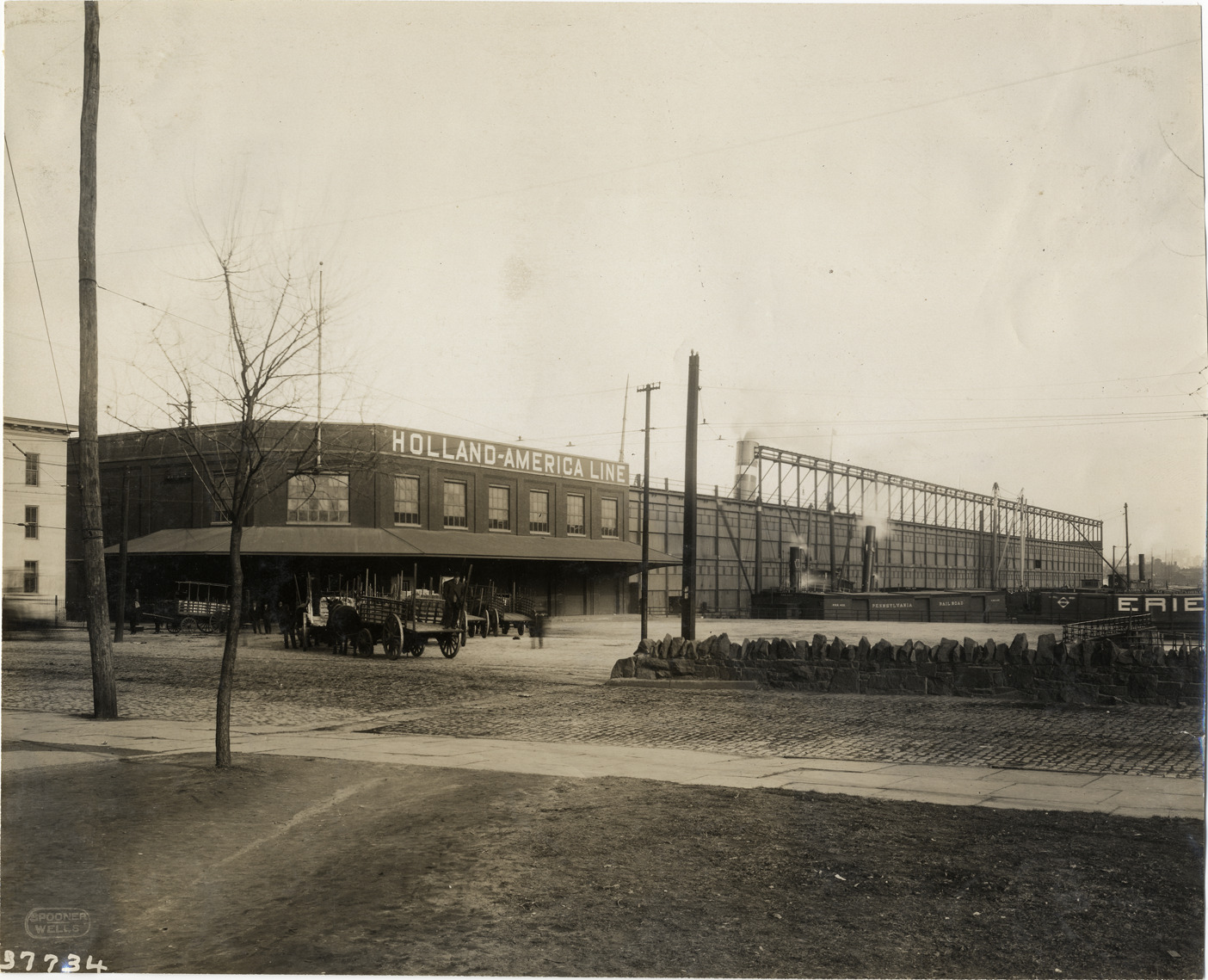 View of Holland America Line shipping offices. Horse-drawn wagons are parked in front of building; brick street in foreground. Railroad freight cars are partially visible on right. Stamped on back: "Spooner & Wells, Inc., photographers, telephones 3472-3473 Columbus, 1931 Broadway, New York." Handwritten on back: "Streets--New York, 1910."