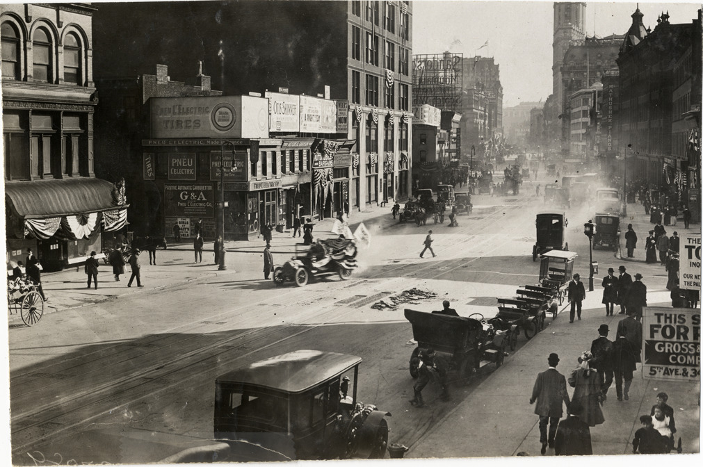 Favorite this☆ Traffic on street, New York Description: View of cars, horse-drawn wagons and pedestrians on street in New York. Commercial buildings in background. Handwritten on back: "Streets--New York, 1908." Details Resource ID: na019170 Subject: Streets--New York (State)--New York Automobiles--New York (State)--New York Horse-drawn vehicles--New York (State)--New York Commercial buildings--New York (State)--New York Photographic prints Date Issued: 1908 Format: 1 photographic print ; 4.5 x 6.75 in. Member of: National Automotive History Collection Lazarnick Collection Filing Location: Streets--New York #2 Rights: Physical rights are retained by DPL. Copyright is retained in accordance with U.S. copyright laws.